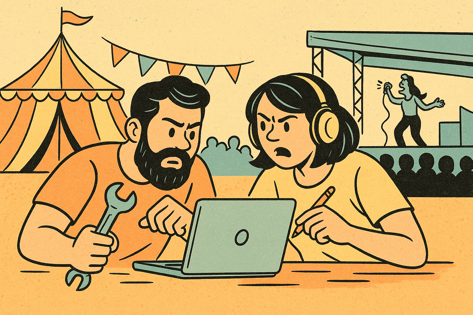 We’re not consultants in suits. We’re the ones who’ve loaded trucks at 4am, defused fights between exhausted stage managers, and kept shows alive when everything was falling apart.We’ve worked behind the scenes of some of the wildest productions in Europe—festivals, clubs, one-off warehouse takeovers. We know that what breaks a show isn’t the sound system—it’s miscommunication, unclear roles, and burnout.That’s why we built The Friction Dept.Not to lecture. To show up. To step in when the pressure’s on and make sure your crew doesn’t just survive, but gets through the storm tighter, stronger, and ready to go again.